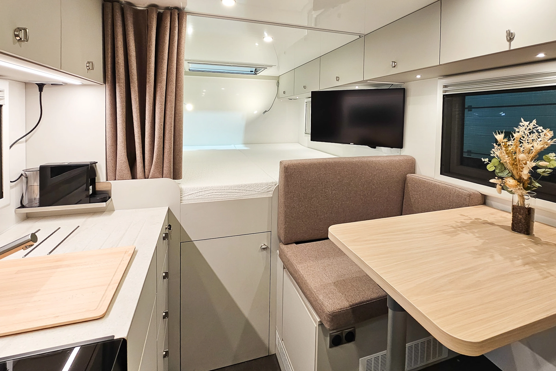 Unsere Innenräume können aus verschiedenen, durchdachten Konzepten ausgewählt werden, die auf unterschiedliche Anforderungen und Wünsche abgestimmt sind. Jedes Konzept wurde entwickelt, um Ihnen maximalen Komfort auf Reisen zu bieten, ohne die Effizienz zu vernachlässigen. Vom kompakten Design für diejenigen, die Funktionalität schätzen und mehr Stauraum für Ausrüstung benötigen, bis hin zu großzügigen Lösungen für Reisende, die mehr Platz und Gemütlichkeit suchen, bieten wir Innenraumaufteilungen, die sich perfekt anpassen lassen.